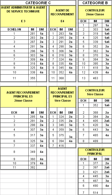 Vous trouverez ci-dessous la nouvelle grille indiciaire au 1er novembre 2006 suite aux accords du 25 janvier 2006 signés par la CFTC et à l'augmentation du point d’indice accordée au 1/11/2006. Nous vous rappelons que les décrets relatifs aux accords statutaires sont en cours de signature par le ministre de la Fonction publique. L’effet sur le traitement sera rétroactif au 1er novembre 2006 ; nous ne connaissons pas, à ce jour, la date à laquelle des services "Paye" seront en mesure de procéder au paiement sur les nouvelles bases indiciaires. Légende IM :