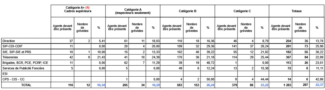 Le taux de grévistes national s'élève à 21,20% (hors Guadeloupe, Martinique, Polynésie et Haute-Corse), le taux le plus élevé s'établissant à 50,87% pour la direction du Finistère.