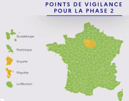 La carte de France ne sera désormais plus verte et rouge mais verte et orange. Tous les départements de France sont maintenant au vert, à l’exception de ceux d’Ile-de-France, de Mayotte et de la Guyane, qui passent à l’orange. « Le déconfinement y sera un peu plus prudent que dans le reste du territoire. », a affirmé Edouard Philippe.