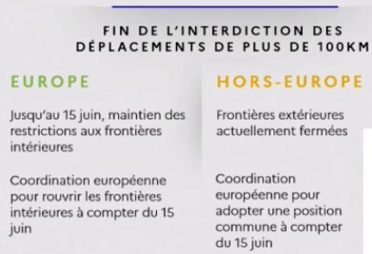 Les restrictions aux frontières intérieures seront elles maintenues jusqu’au 15 juin. Des concertations à l’échelle européenne auront lieu dès le mois de juin pour une réouverture des frontières, actuellement fermées.
